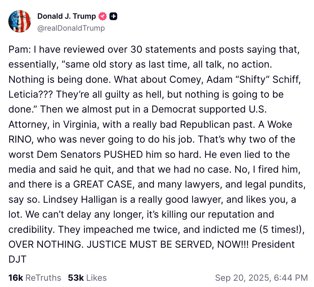 But in the Eastern District of Virginia, Bondi appears to have gotten sloppy. She never made Trump’s insurance lawyer Lindsey Halligan the first assistant or a special attorney. She simply installed her as interim US Attorney — a move that has been rejected by three different courts now. Halligan’s position is thus uniquely vulnerable, as are the indictments of AG James and former FBI director James Comey. Halligan signed the indictments herself, since no other lawyer in EDVA would get near those cases. So, if her appointment is illegal, then those indictments are likely a nullity.