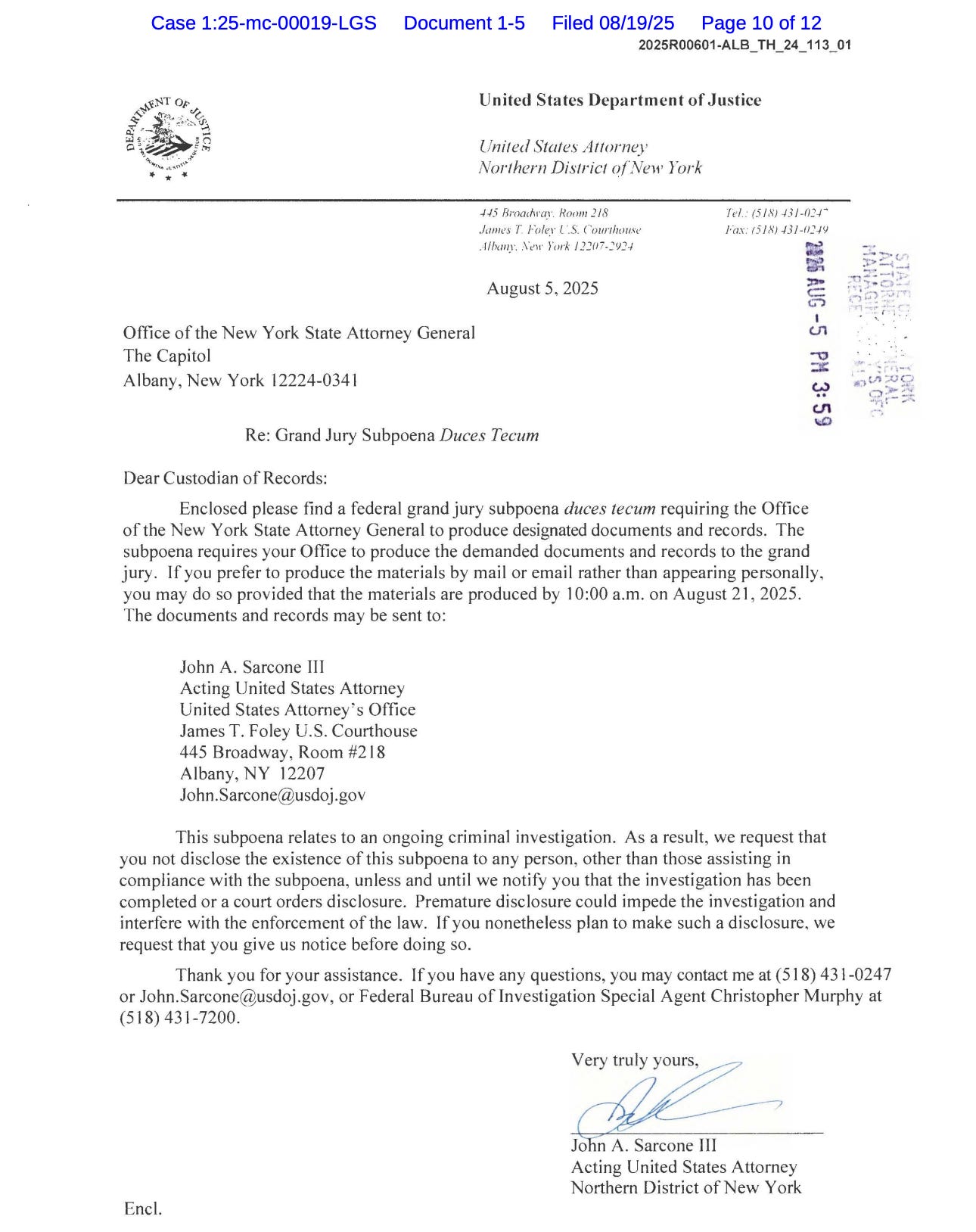 Sarcone will have to argue that his position is more like Essayli’s than Halligan’s. On the one hand, his name is the only one on the subpoenas, which he signed as “Acting United States Attorney.”