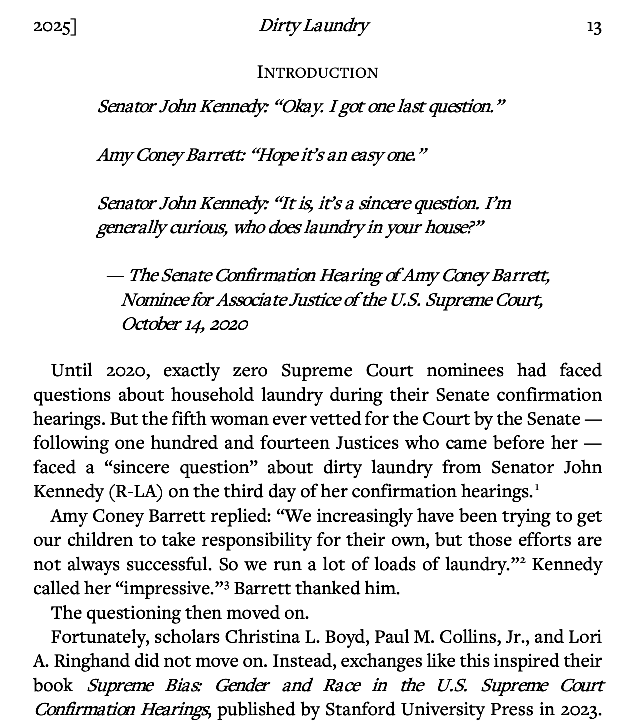 After announcing the publication of my new article Ethics Accountability: The Next Era for Lawyers and Judges last week I have another to share hot off the press🔥, this one co-authored with Hannah Johnson (Southern Illinois) and published in the U.C. Davis Law Review. You can download Dirty Laundry: A Book Review of Supreme Bias: Gender and Race in U.S. Supreme Court Confirmation Hearings by Christina L. Boyd, Paul M. Collins, Jr., and Lori A. Ringhand (Stanford University Press) for free at this link. Here’s a teaser.