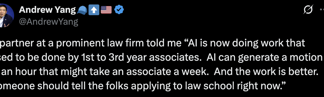 To be a little more fair to the unduly credulous Yang, AI might be doing some work that used to be done by junior associates, but most of that sort of drudgery — the proverbial first-pass review in a Topeka warehouse — had already been outsourced one way or another years ago. The work that departed in favor of contract attorneys in the 2000s may now be in the hands of an algorithm, but that’s not what this Tweet is about.