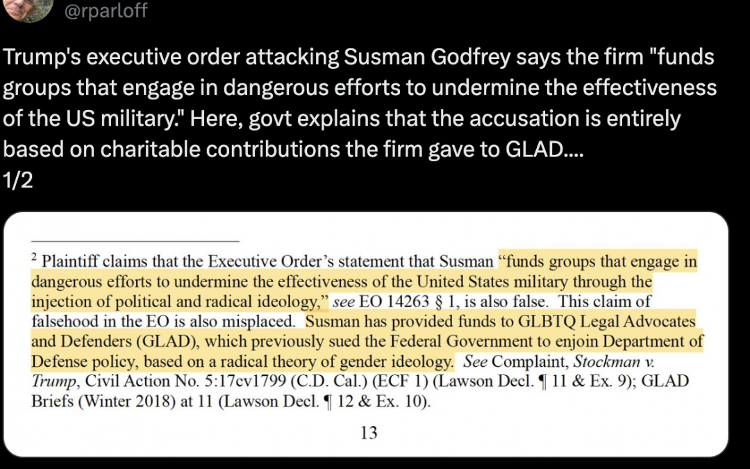 There’s a new “Axis of Evil” in the Trump administration cosmology and it’s not al Qaeda or North Korea. Instead, the preeminent threat to national security, according to the hapless folks at Donald Trump’s personal law firm, is anyone who ever donated money to LGBTQ civil rights organization GLAD. At least that’s the government’s new working theory as it tries to justify its retaliatory executive order against Susman Godfrey.